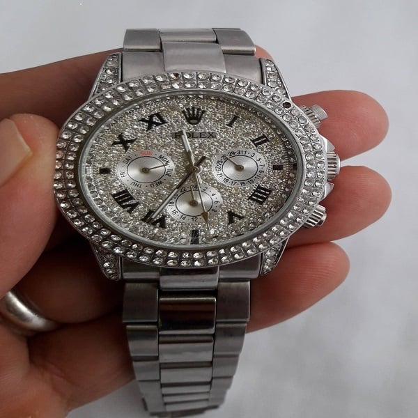 Boîtier en acier inoxydable avec un bracelet Rolex Oyster en acier inoxydable. Lunette fixe. Cadran noir avec aiguilles argentées et index des heures. Marqueurs minutes autour du bord extérieur. Type de numérotation : analogique. Chronographe - sous-cadrans affichant : trois - 60 secondes, 30 minutes et 12 heures. Mouvement automatique Rolex Calibre 4130 avec environ 72 heures de réserve de marche. Verre saphir résistant aux rayures. Couronne vissée. Fond de boîtier solide. Taille du boîtier : 40 mm. Forme ronde du boîtier. Fermoir Oysterlock. Fonctions : chronographe, heure, minute, seconde. Style de montre de luxe. Étiquette de la montre : Swiss Made. Montre pour femme Rolex Daytona Dial en acier inoxydable Oyster.
